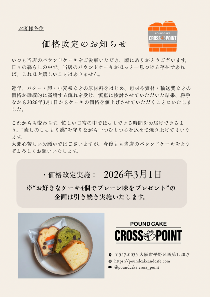 これまで当店では、できる限り価格を据え置きながら製造を続けてまいりましたが、現行価格でのご提供が難しい状況となり、誠に心苦しい限りではございますが、パウンドケーキの価格を改定させていただくこととなりました。
